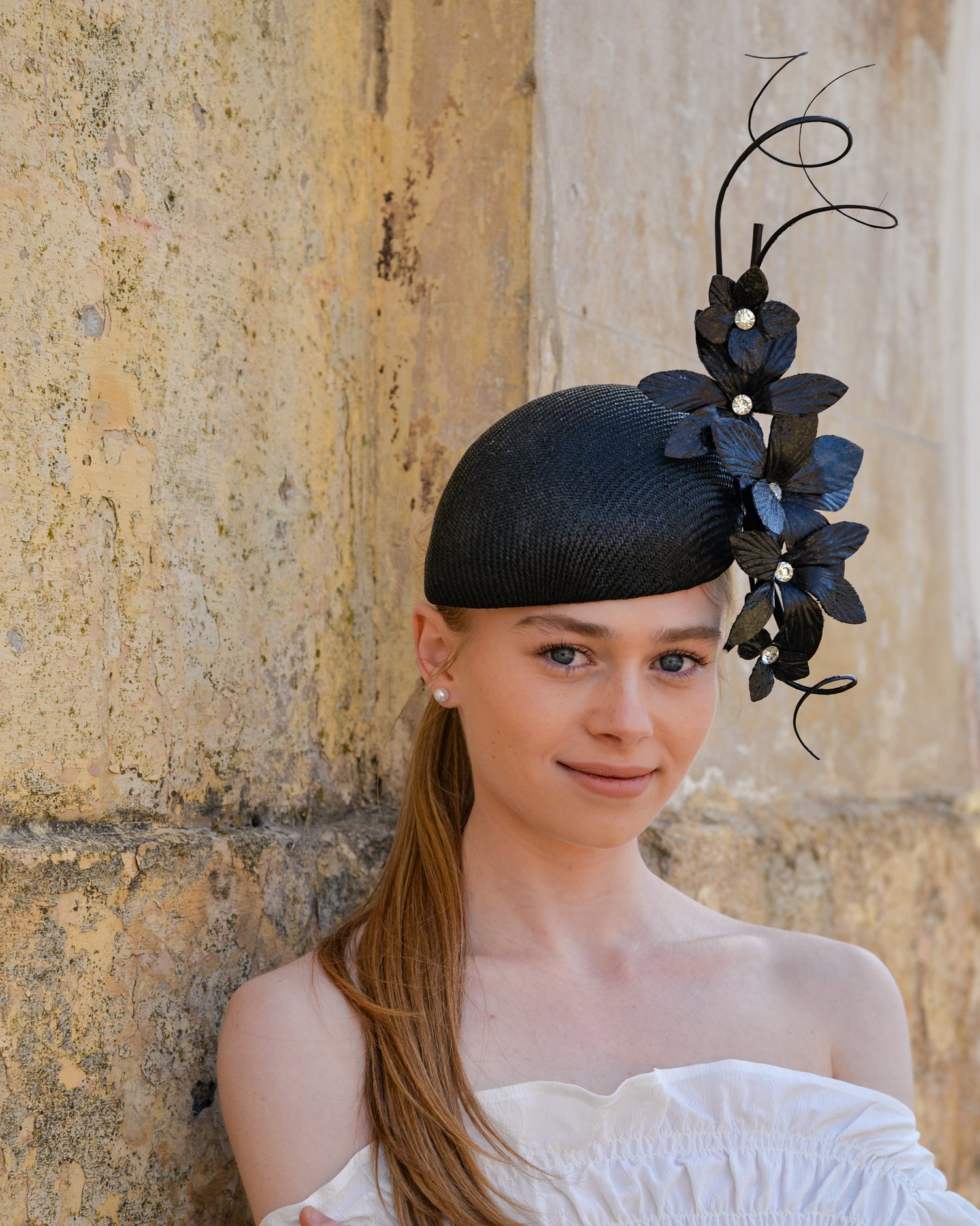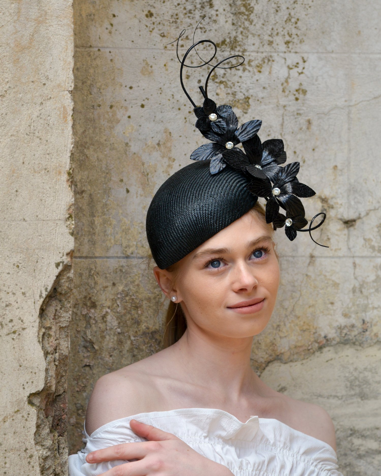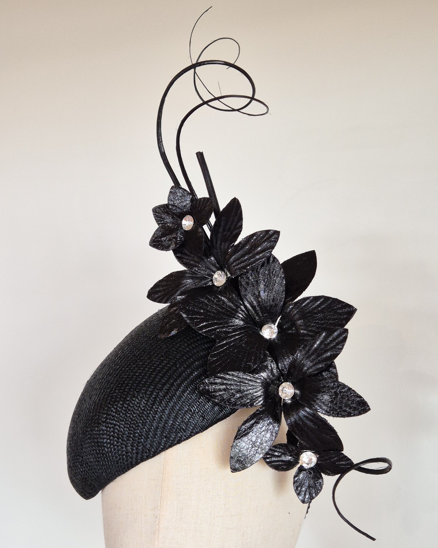 'Astrid' features a classic black hand-blocked straw hugger/beret headpiece adorned with cascading leather-look orchids, each centered with a sparkling crystal, and finished with three curled quills.