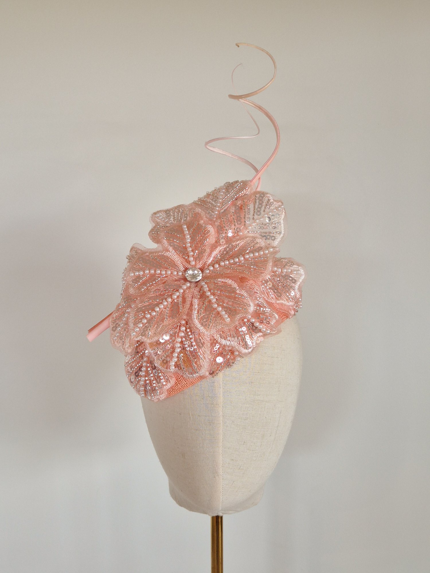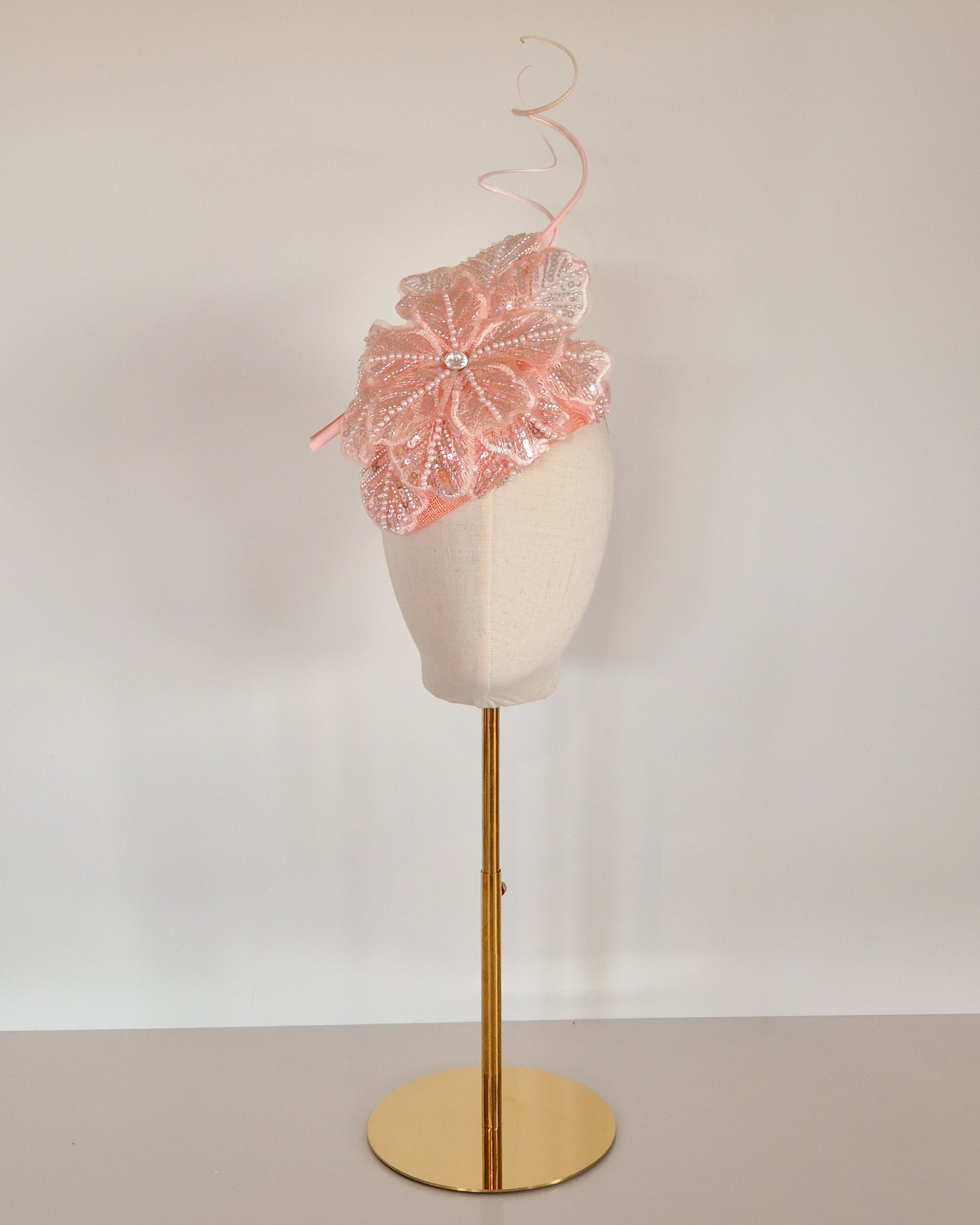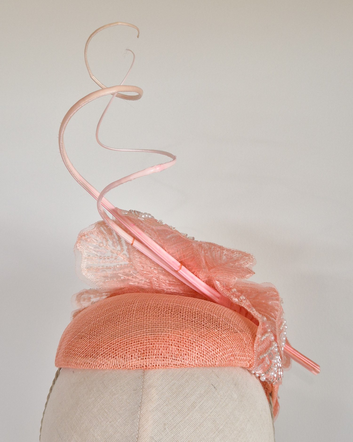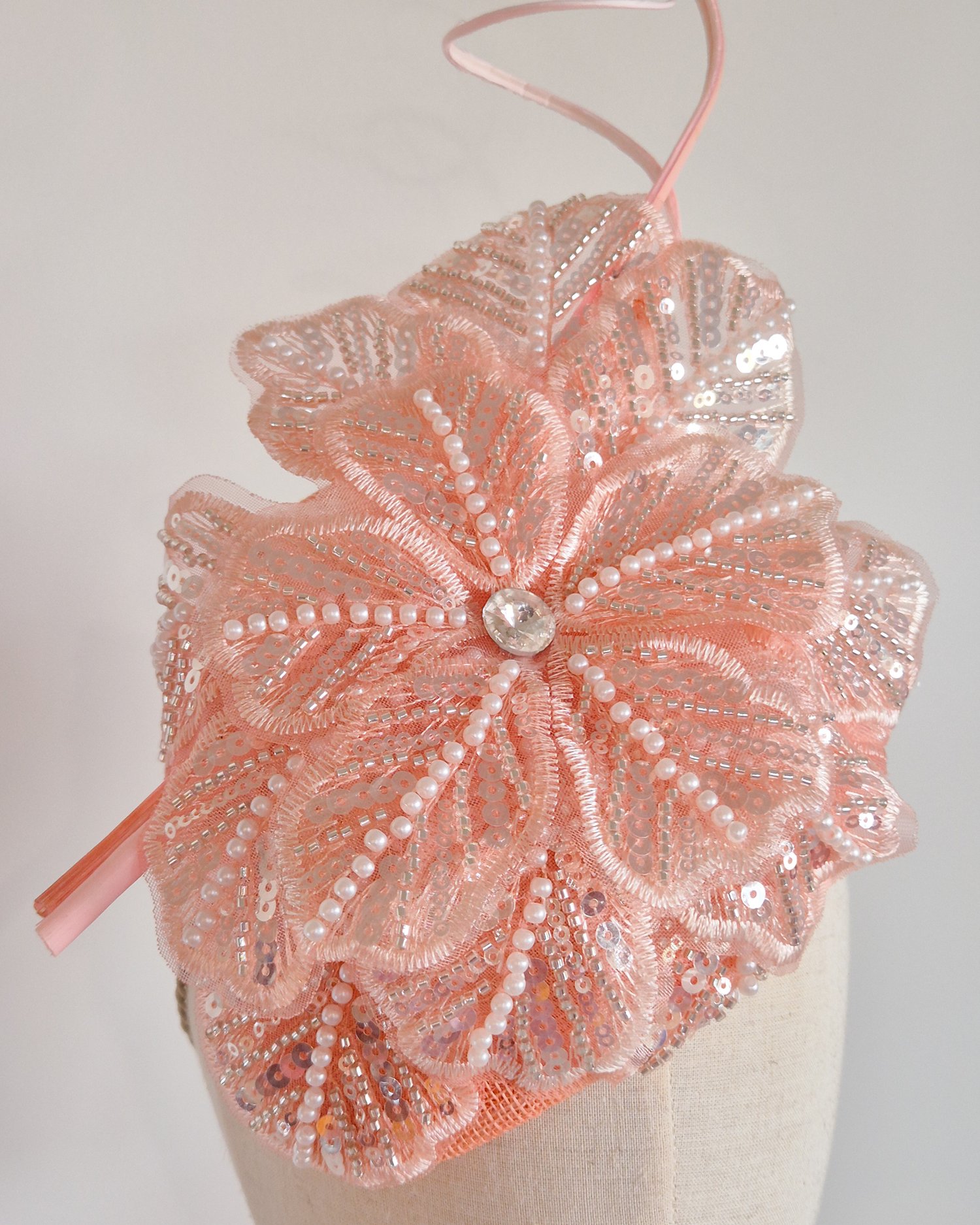 'Iris' features a coral simamay hugger headpiece with stunning coral lace flower with pearl beading and a crystal centre, finished with curled quills that adds dramatic height.