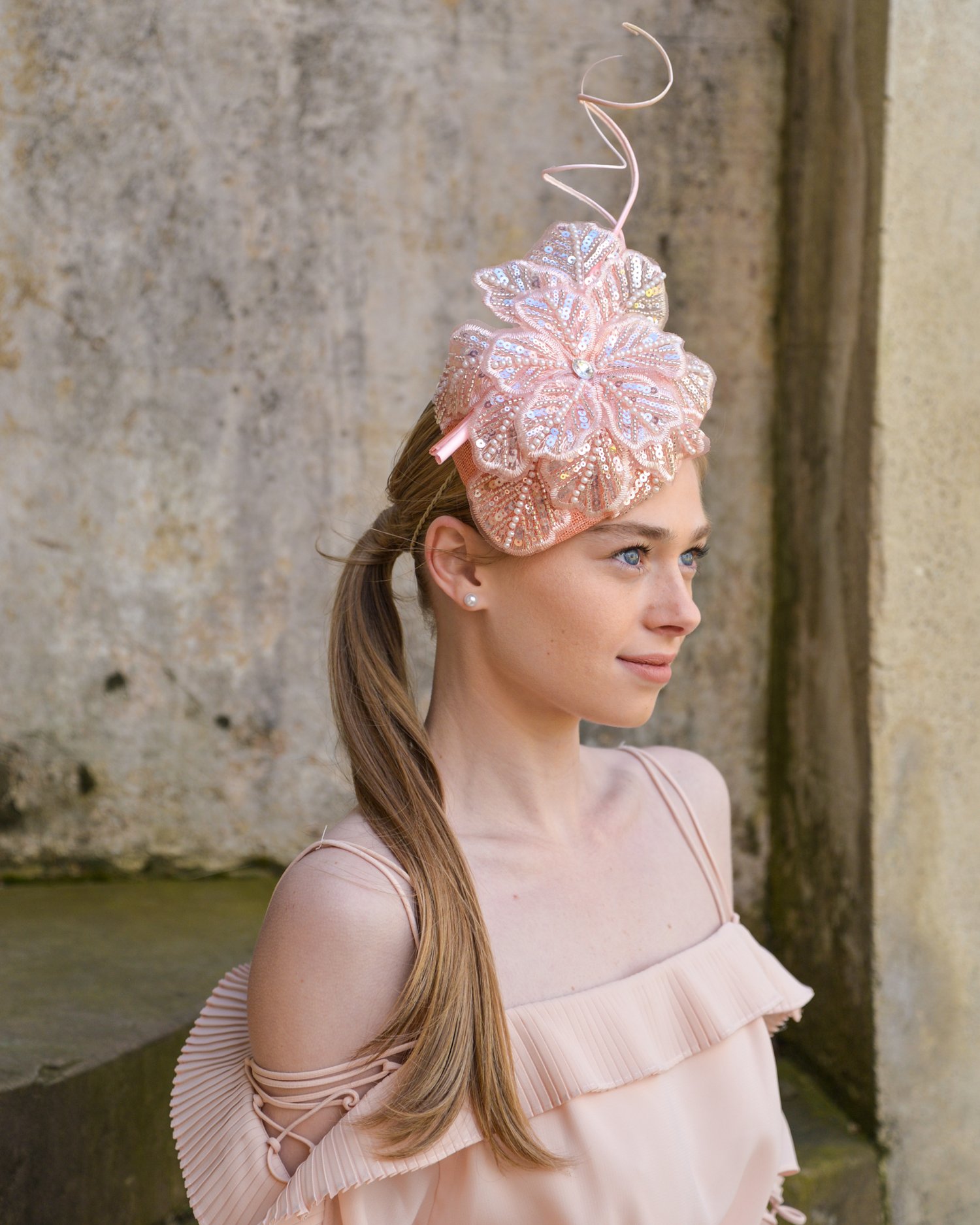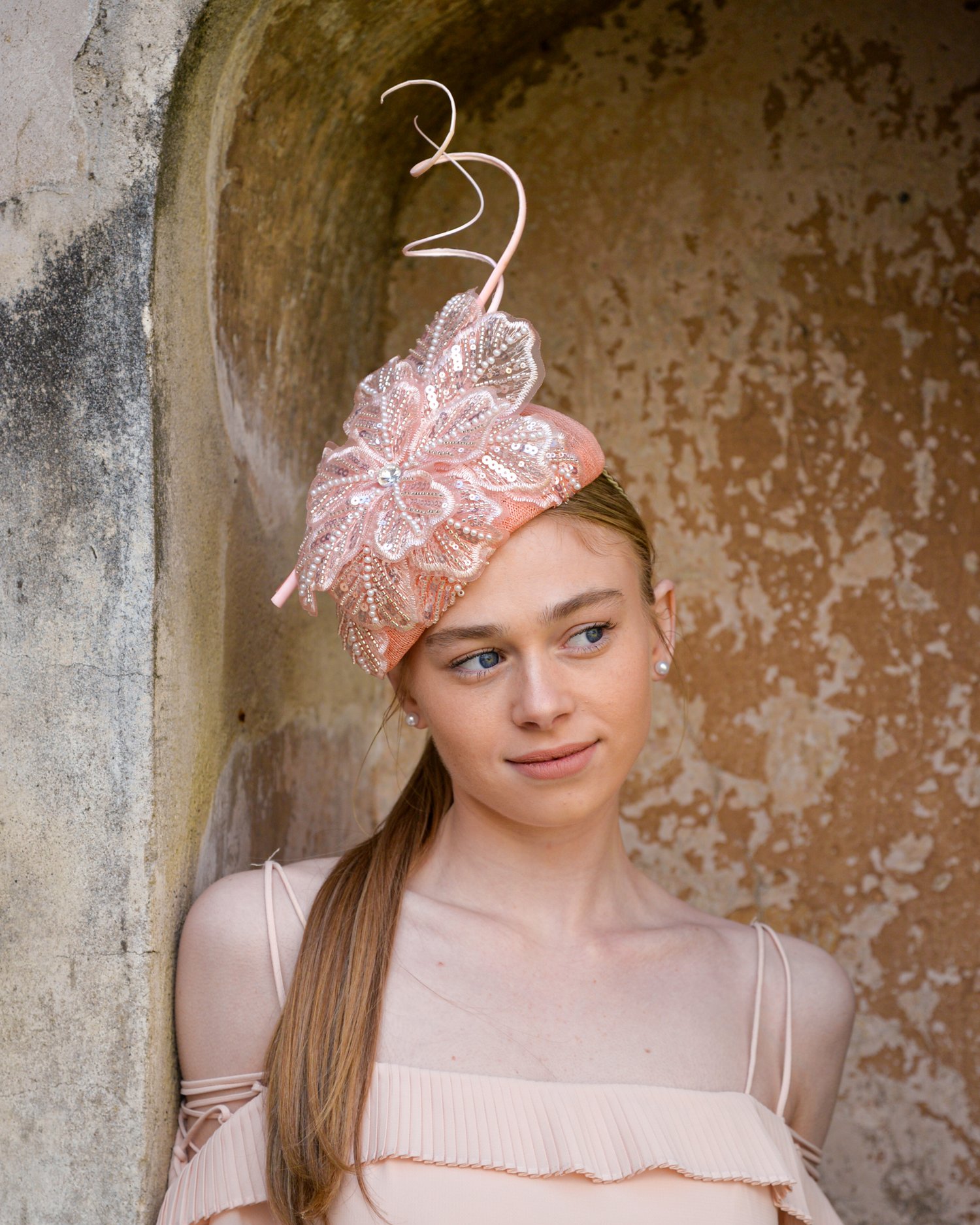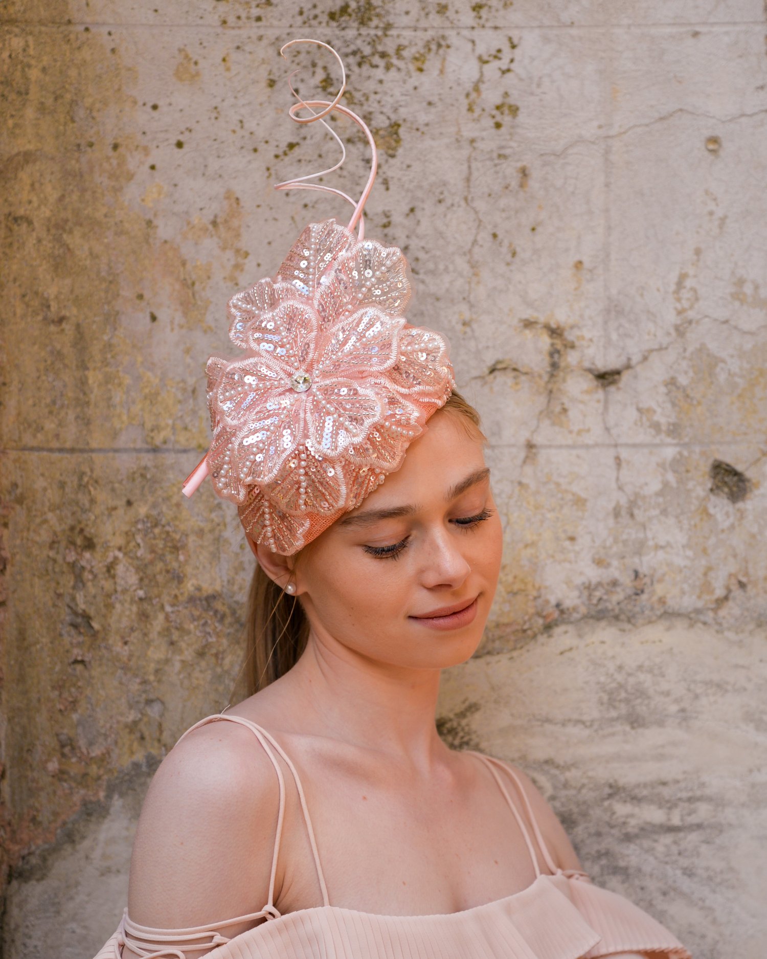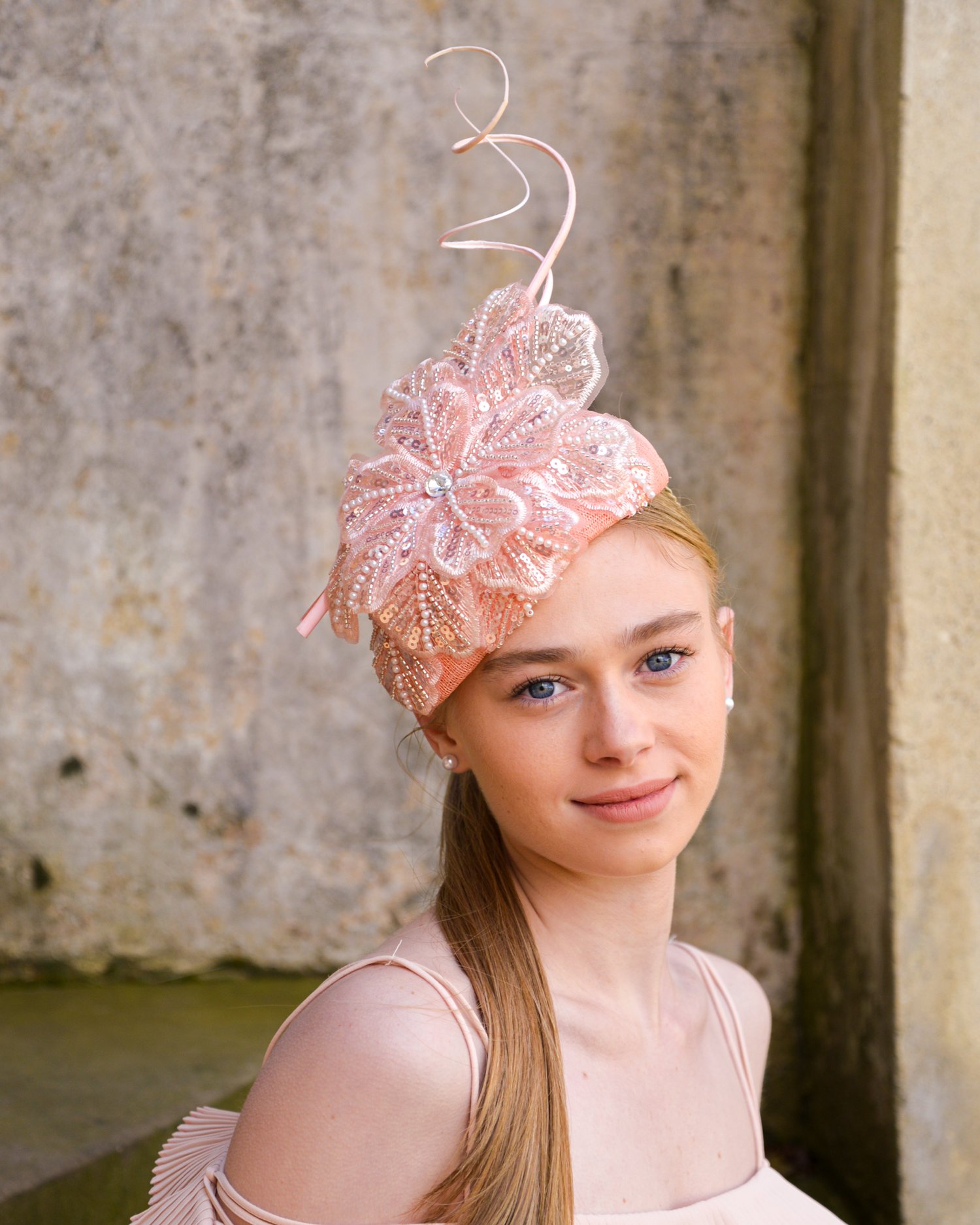 'Iris' features a coral simamay hugger headpiece with stunning coral lace flower with pearl beading and a crystal centre, finished with curled quills that adds dramatic height.